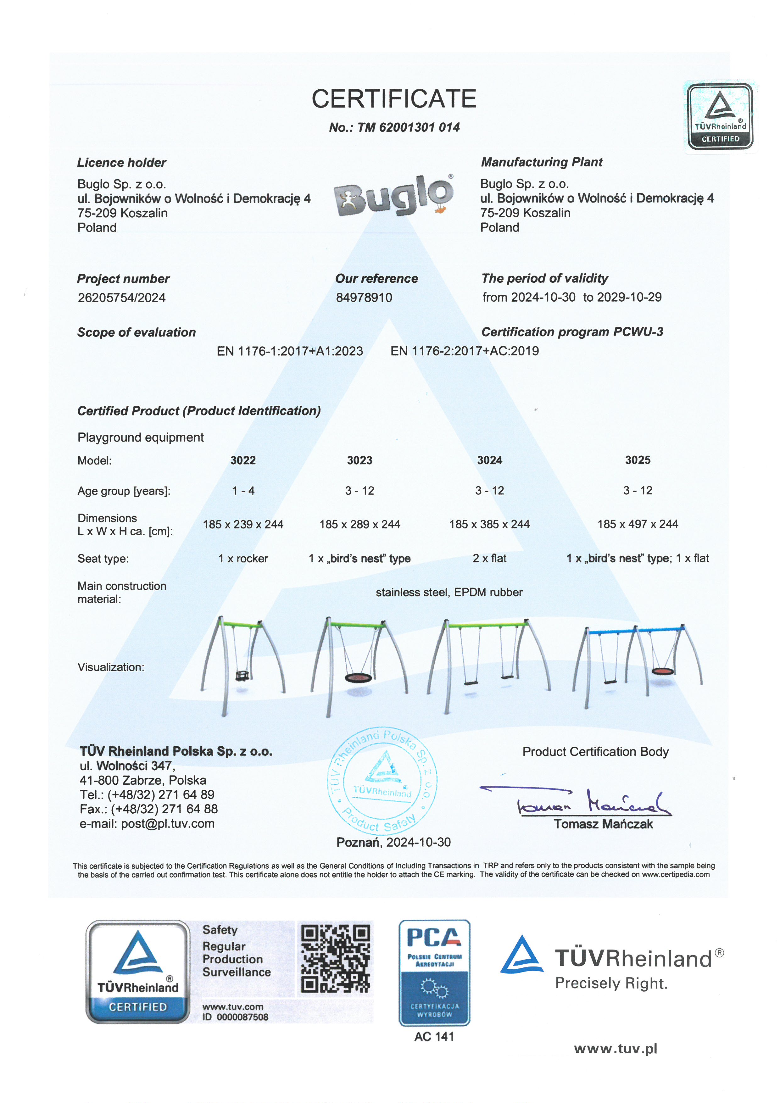 Toate echipamentele de recreere și de joacă trebuie să dețină certificate de conformitate cu seria de standarde EN 1176 – Echipamente și suprafețe pentru spații de joacă, (în cazul echipamentelor de fitness și street workout, standardul este EN 16630:2015).