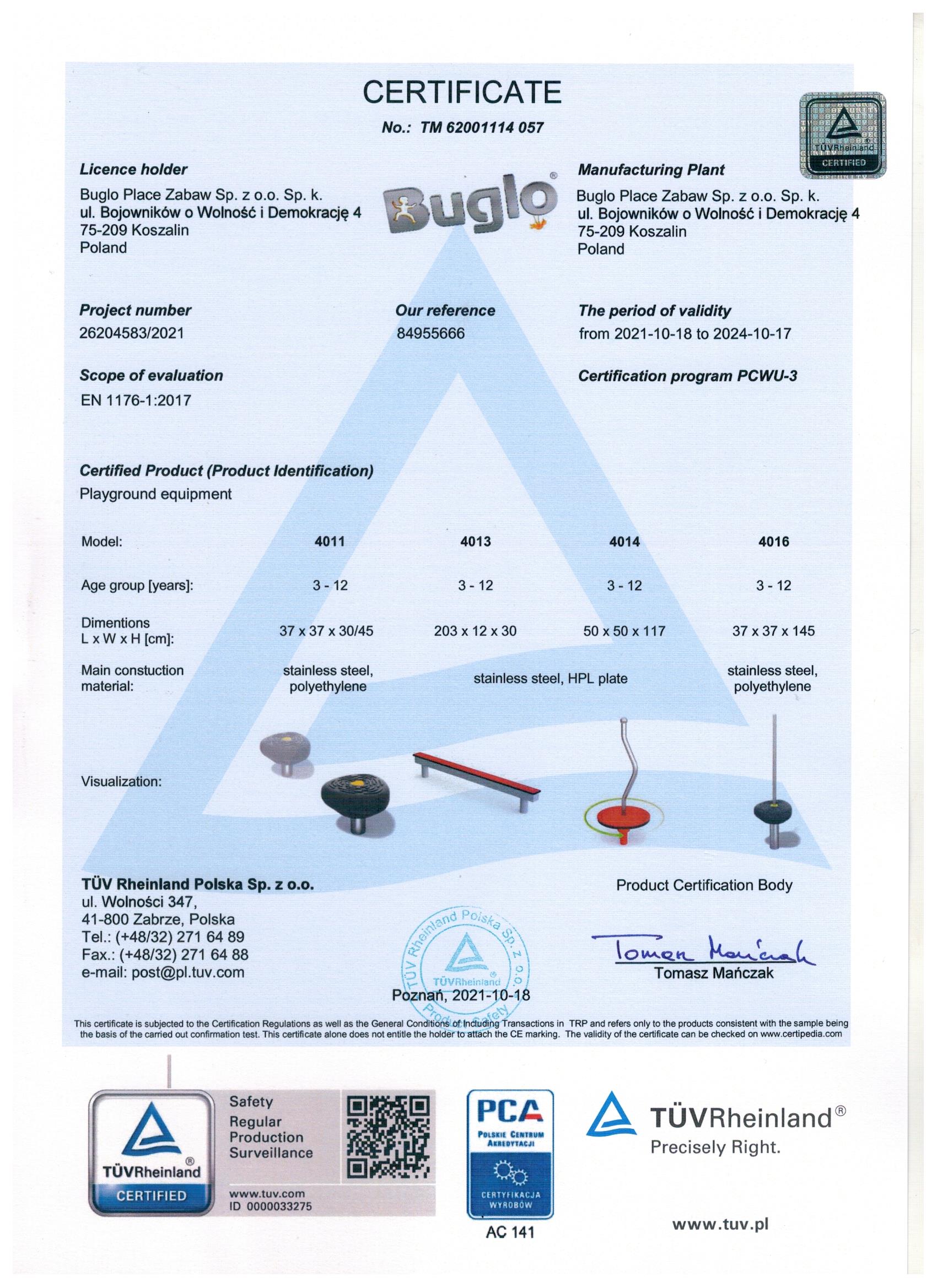 Toate echipamentele de recreere și de joacă trebuie să dețină certificate de conformitate cu seria de standarde EN 1176 – Echipamente și suprafețe pentru spații de joacă, (în cazul echipamentelor de fitness și street workout, standardul este EN 16630:2015).