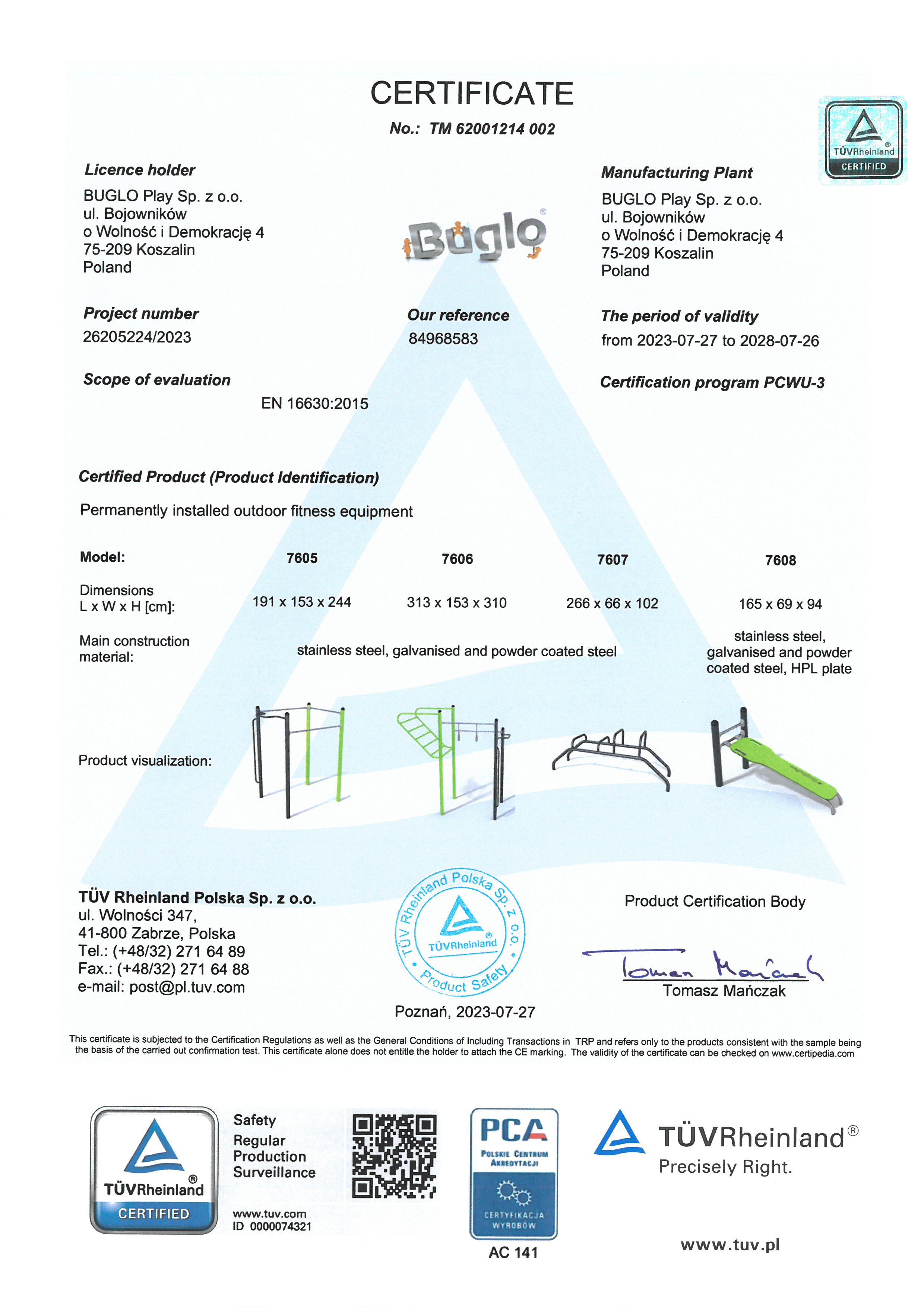 Toate echipamentele de recreere și de joacă trebuie să dețină certificate de conformitate cu seria de standarde EN 1176 – Echipamente și suprafețe pentru spații de joacă, (în cazul echipamentelor de fitness și street workout, standardul este EN 16630:2015).