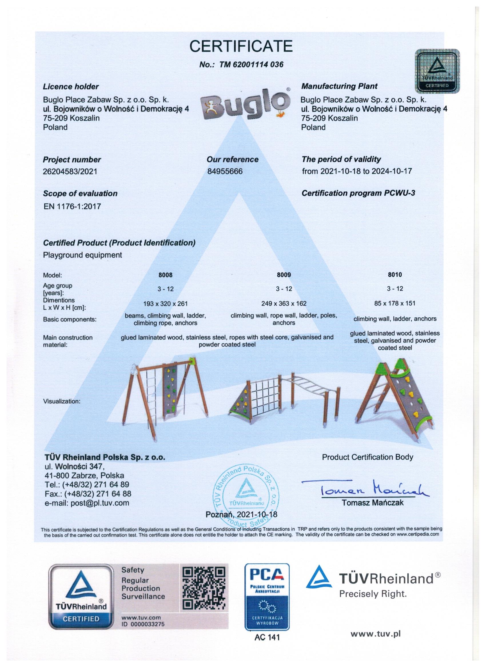 Toate echipamentele de recreere și de joacă trebuie să dețină certificate de conformitate cu seria de standarde EN 1176 – Echipamente și suprafețe pentru spații de joacă, (în cazul echipamentelor de fitness și street workout, standardul este EN 16630:2015).