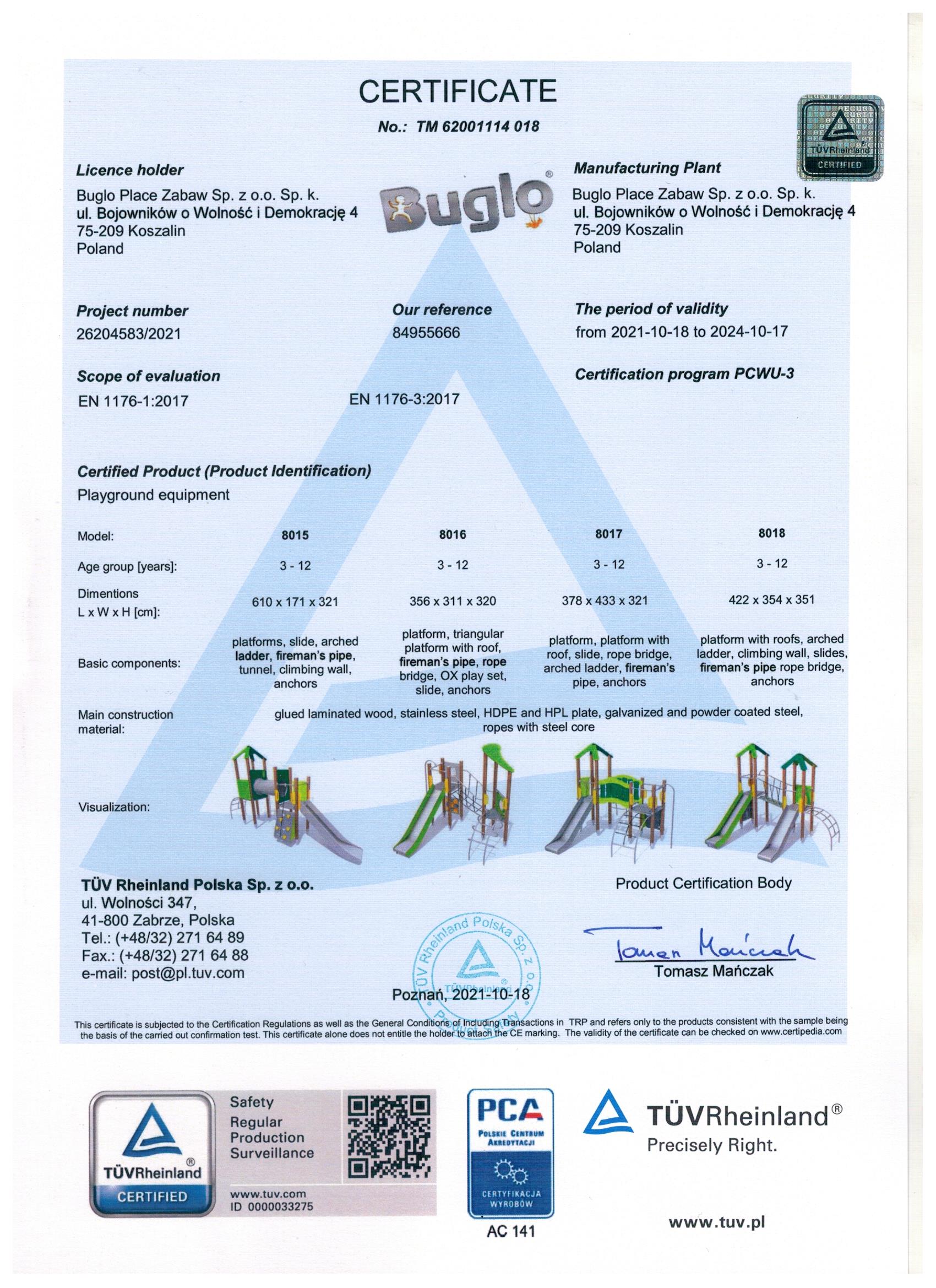 Toate echipamentele de recreere și de joacă trebuie să dețină certificate de conformitate cu seria de standarde EN 1176 – Echipamente și suprafețe pentru spații de joacă, (în cazul echipamentelor de fitness și street workout, standardul este EN 16630:2015).