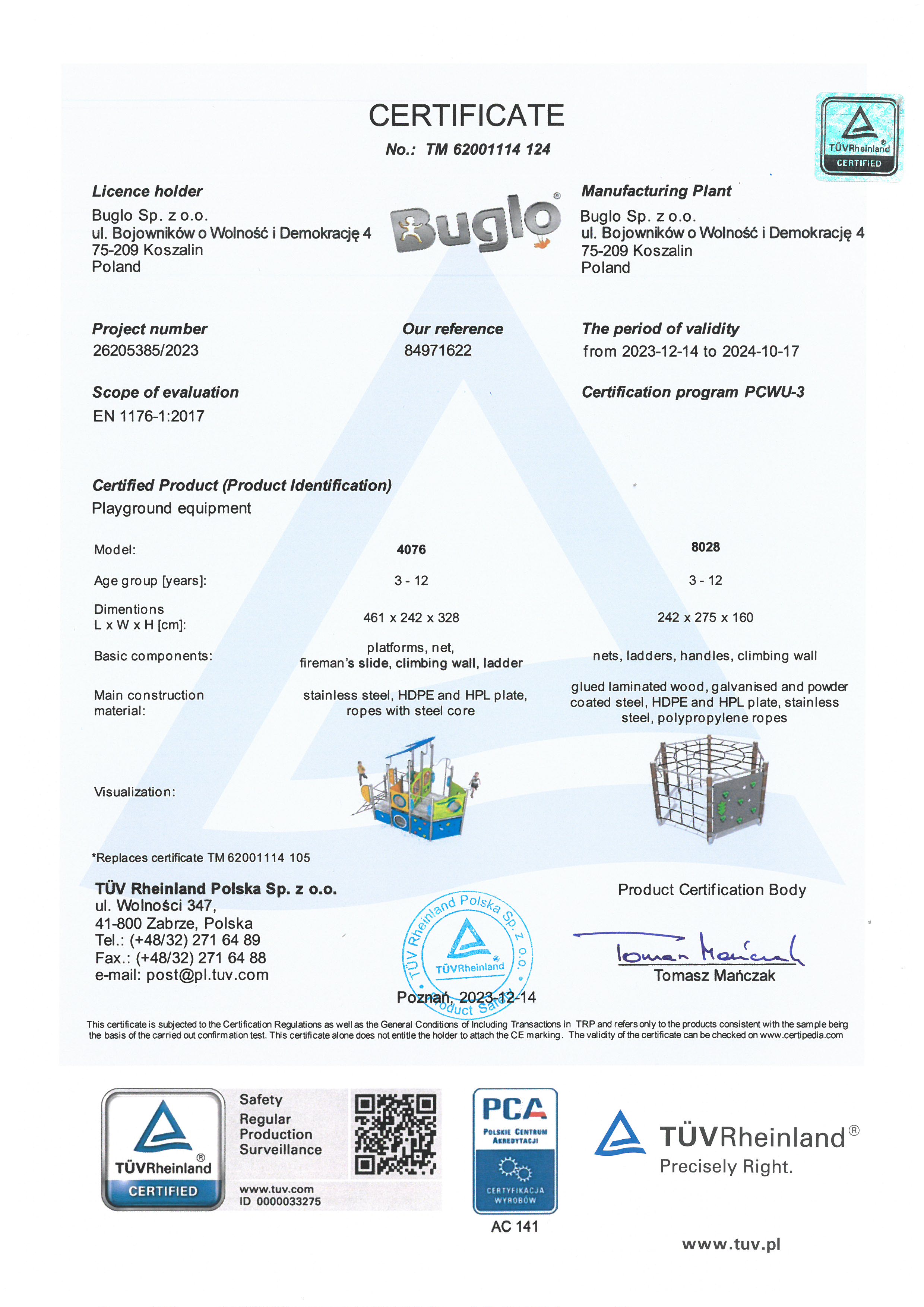 Toate echipamentele de recreere și de joacă trebuie să dețină certificate de conformitate cu seria de standarde EN 1176 – Echipamente și suprafețe pentru spații de joacă, (în cazul echipamentelor de fitness și street workout, standardul este EN 16630:2015).