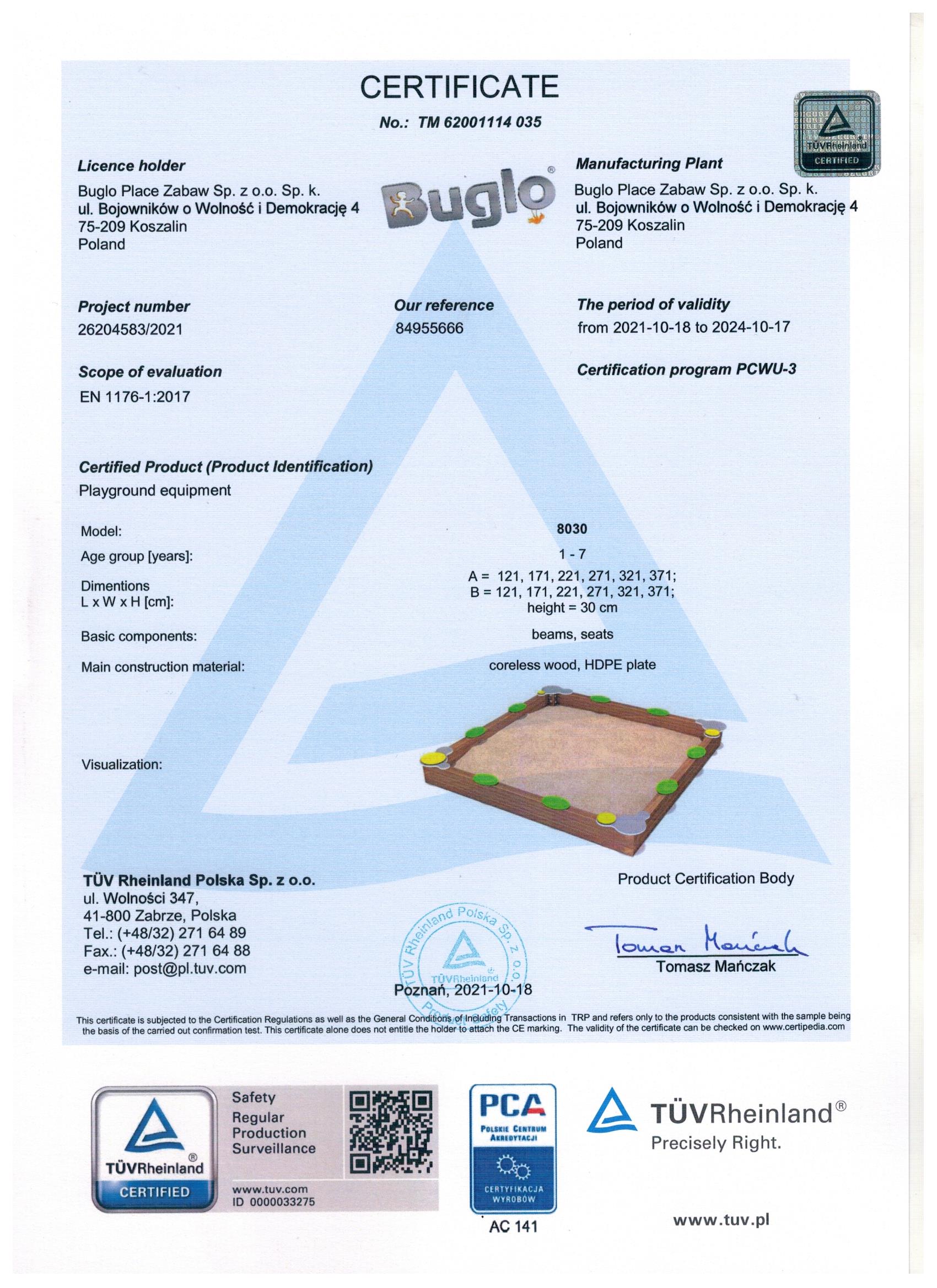 Toate echipamentele de recreere și de joacă trebuie să dețină certificate de conformitate cu seria de standarde EN 1176 – Echipamente și suprafețe pentru spații de joacă, (în cazul echipamentelor de fitness și street workout, standardul este EN 16630:2015).