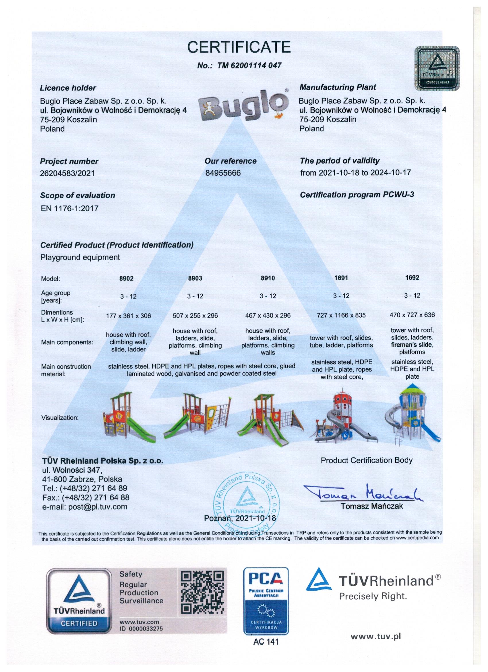 Toate echipamentele de recreere și de joacă trebuie să dețină certificate de conformitate cu seria de standarde EN 1176 – Echipamente și suprafețe pentru spații de joacă, (în cazul echipamentelor de fitness și street workout, standardul este EN 16630:2015).