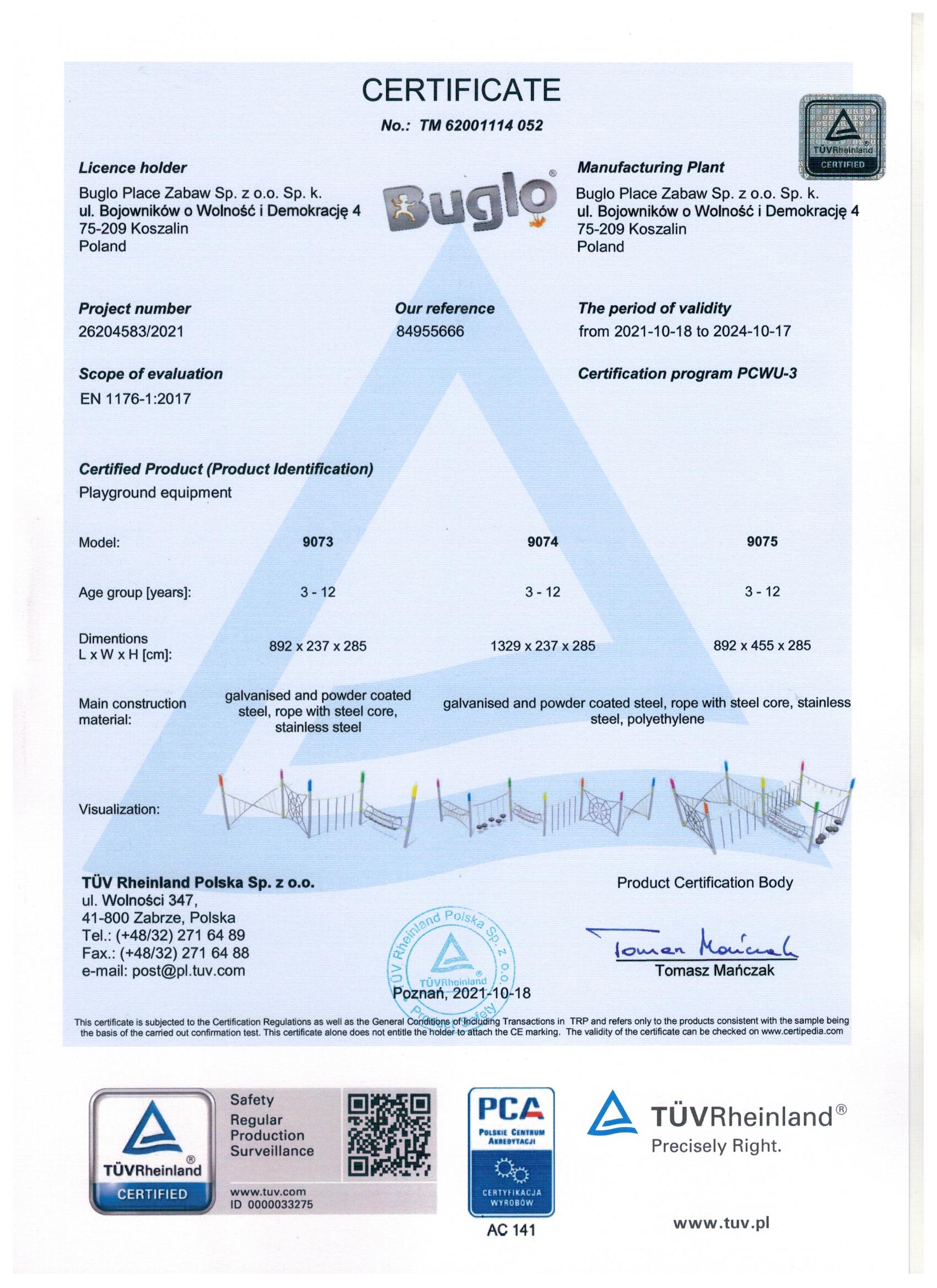 Toate echipamentele de recreere și de joacă trebuie să dețină certificate de conformitate cu seria de standarde EN 1176 – Echipamente și suprafețe pentru spații de joacă, (în cazul echipamentelor de fitness și street workout, standardul este EN 16630:2015).
