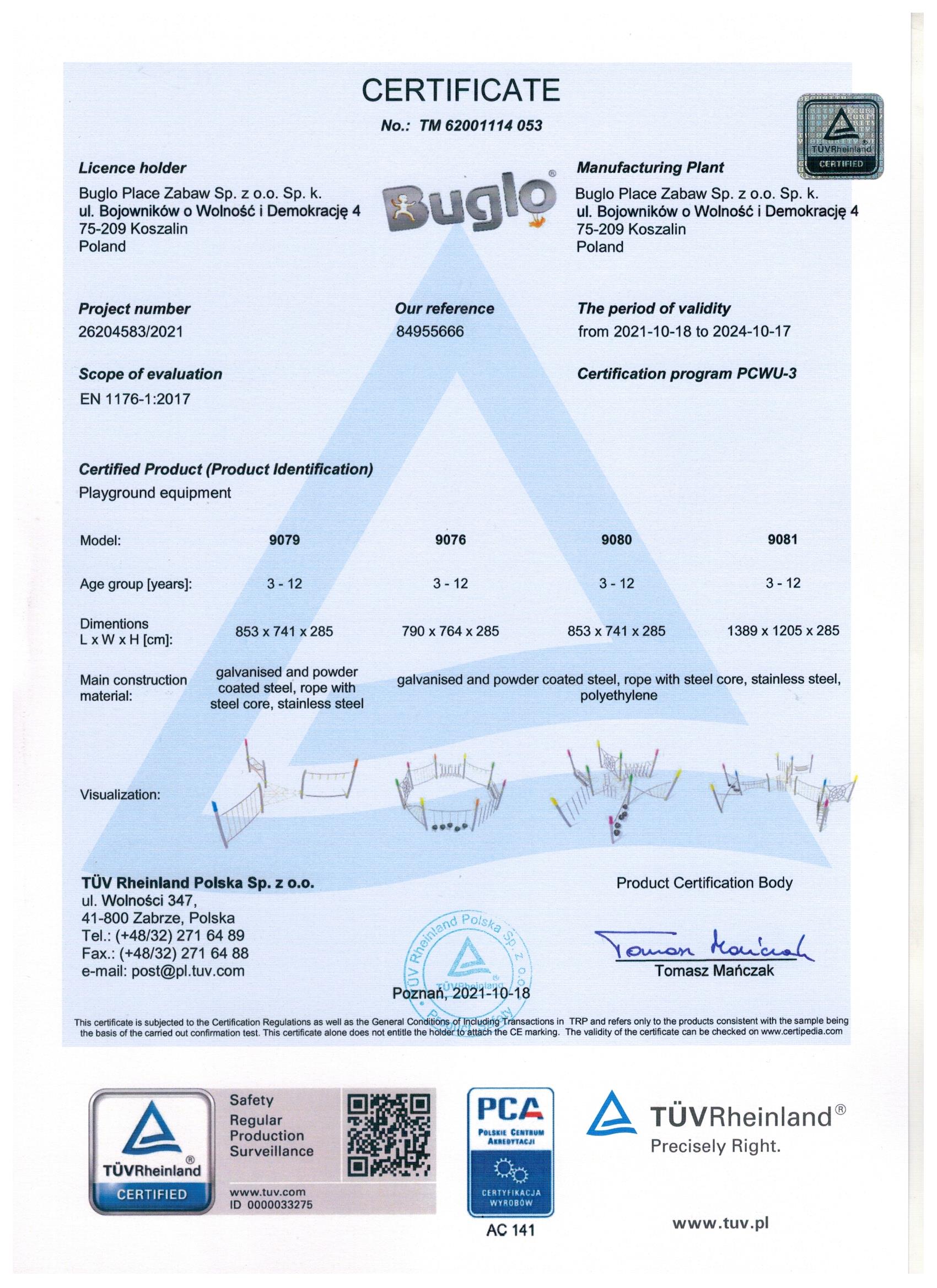 Toate echipamentele de recreere și de joacă trebuie să dețină certificate de conformitate cu seria de standarde EN 1176 – Echipamente și suprafețe pentru spații de joacă, (în cazul echipamentelor de fitness și street workout, standardul este EN 16630:2015).