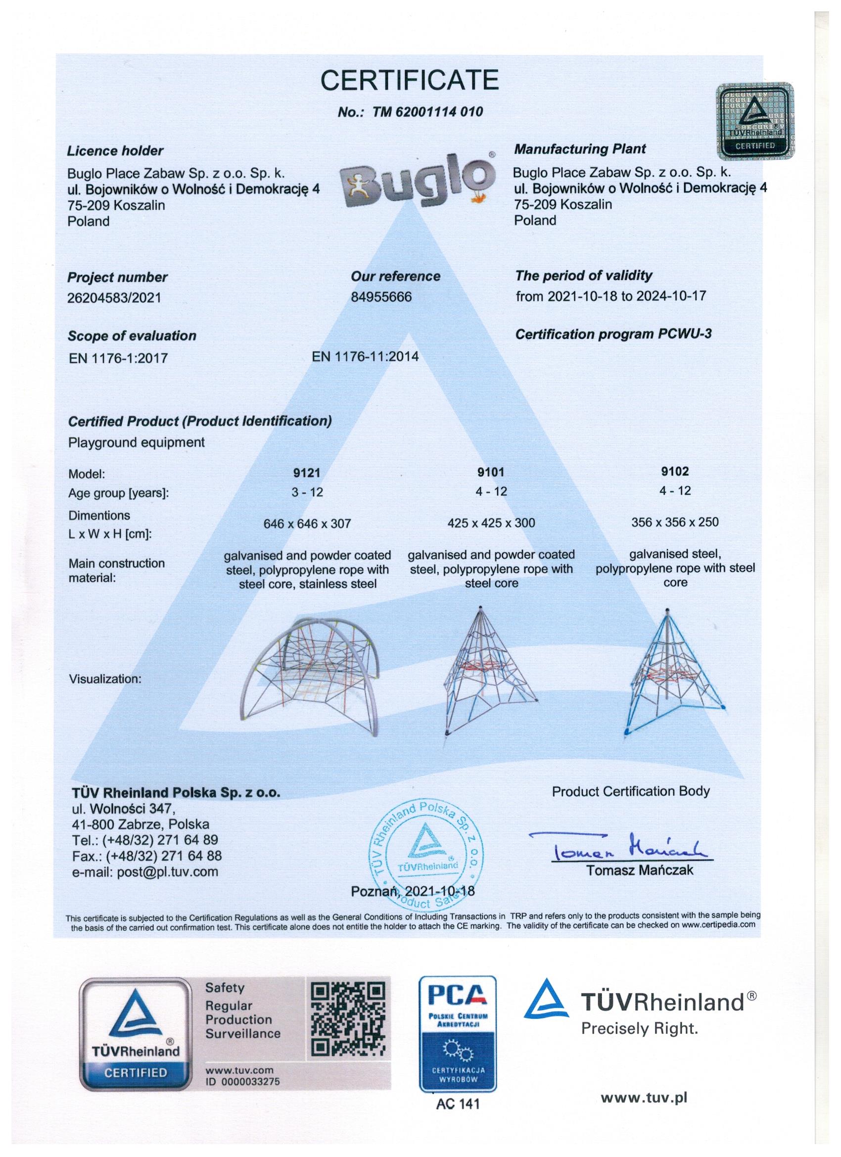 Toate echipamentele de recreere și de joacă trebuie să dețină certificate de conformitate cu seria de standarde EN 1176 – Echipamente și suprafețe pentru spații de joacă, (în cazul echipamentelor de fitness și street workout, standardul este EN 16630:2015).