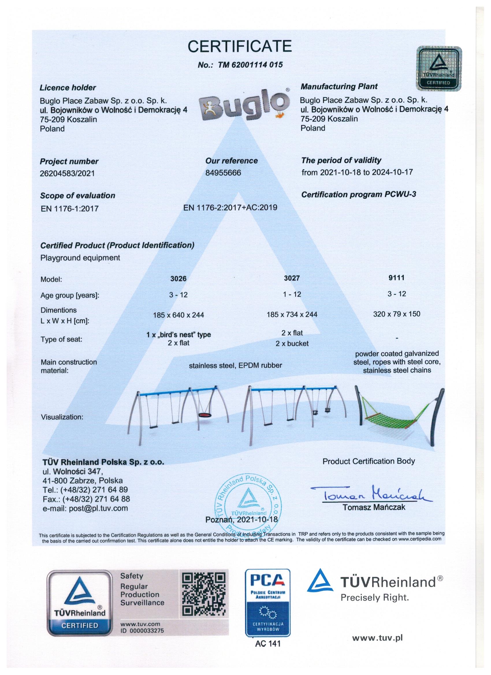 Toate echipamentele de recreere și de joacă trebuie să dețină certificate de conformitate cu seria de standarde EN 1176 – Echipamente și suprafețe pentru spații de joacă, (în cazul echipamentelor de fitness și street workout, standardul este EN 16630:2015).