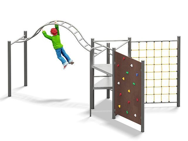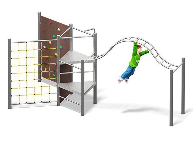| Descriere: | Echipament de catarare format dintr-un turn de forma triunghiulara, metalic, cu trei extensii dispuse triunghiular: perete de catarare, plasa de catarare si cataratoare arcuita metalica, oferind posibilitati multiple de abordare ale catararii. Echipament produs în Germania. | ||||||||||||||||||