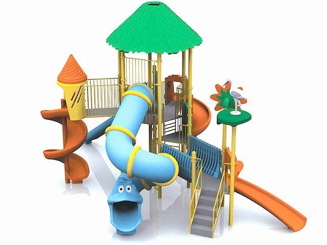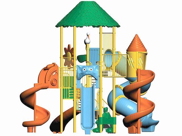 | Descriere: | Ansamblu de joacă cu trei turnuri, din care cel central de formă hexagonală, cu acoperiș, cu cinci tobogane, două spiralate, unul cilindric răsucit, unul clasic și unul curbat, cu scară de acces și decorațiuni cu păsări și flori. | |||||||||||||||||||